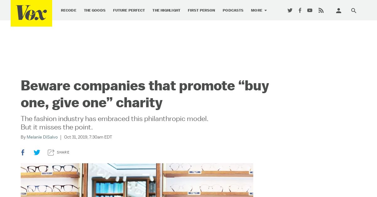取得元URL: https://www.vox.com:443/first-person/2019/10/31/20938273/charity-warby-parker-cora-fast-fashion-buy-one-give-one