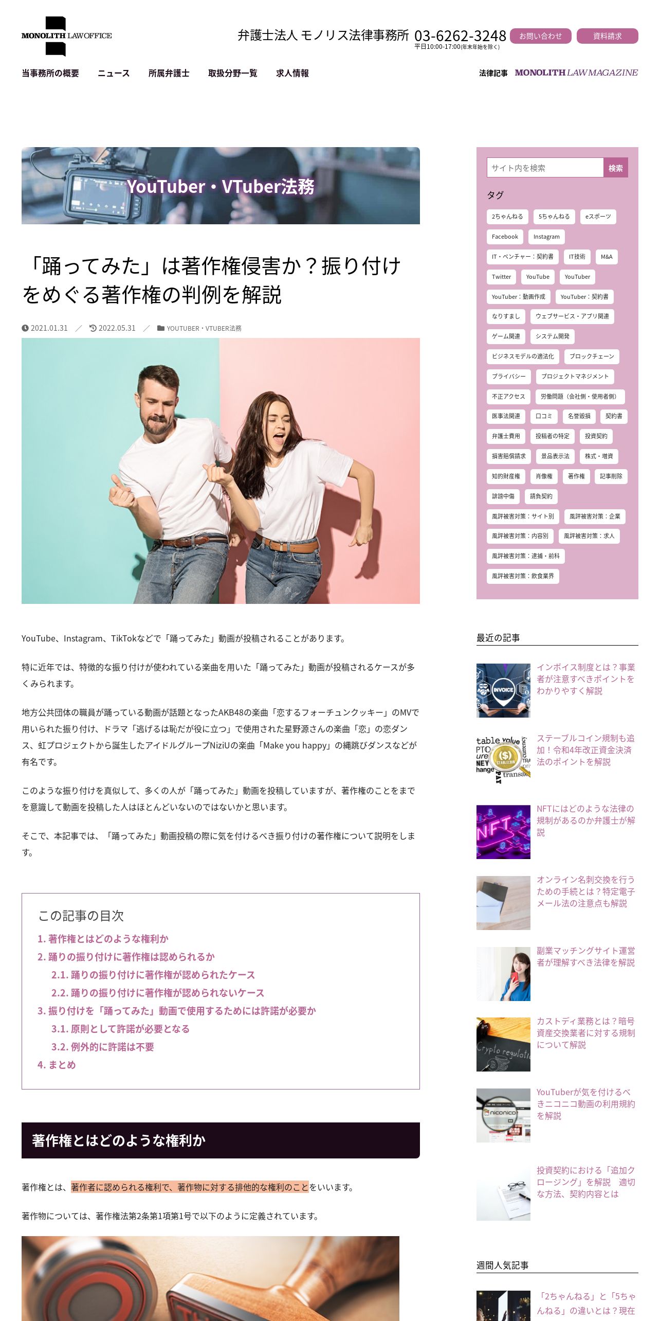 https://monolith-law.jp:443/youtuber-vtuber/tried-to-dance-copyright-infringement
